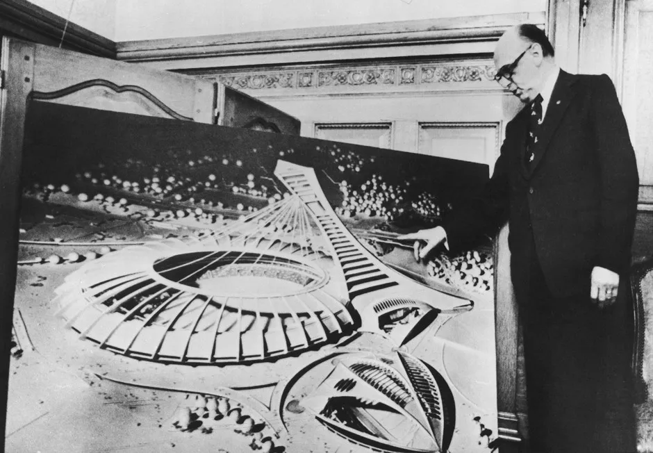 前市长让·德拉波指着1976年奥运会前蒙特利尔奥林匹克体育场的效果图。美联社照片在1976年7月的一个星期里,蒙特利尔的舍布鲁克街变成了一条宏伟的装置艺术走廊,恰如其分地命名为Corridart。它旨在展示魁北克艺术界的先锋艺术——当时和现在主要集中在蒙特利尔——并作为第21届奥林匹克运动会的文化组成部分。它在市长的命令下被摧毁。