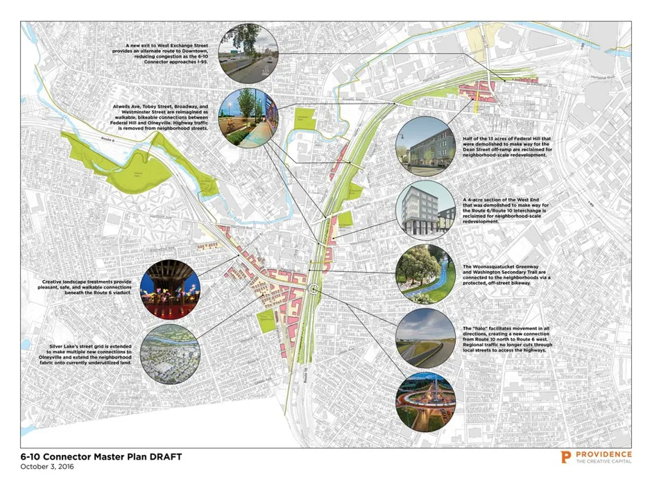 6-10连接线的改造可能是加强普罗维登斯作为城市的下一个重大举措。这条高速公路,像全国许多同时代的高速公路一样,已经到了其使用寿命的尽头,需要进行广泛且昂贵的重建。越来越多的城市和州意识到城市高速公路重建的必要性,将其视为修复因高速公路而受损的城市结构的机会。随着这些机会而来的是两种选择:完全拆除高速公路,或以减轻其负面影响的方式进行升级。