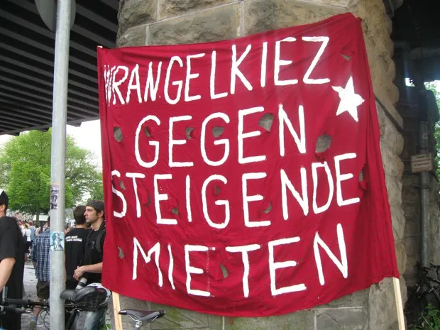 一条抗议克罗伊茨贝格地区租金上涨的横幅。quapan/Flickr马克斯的情况,正如他坦率承认的,与许多当前的柏林Airbnb房东有所不同。他不仅拥有自己的房子,而不是租住,他遵守新法律,而他周围的邻居则在违反它。