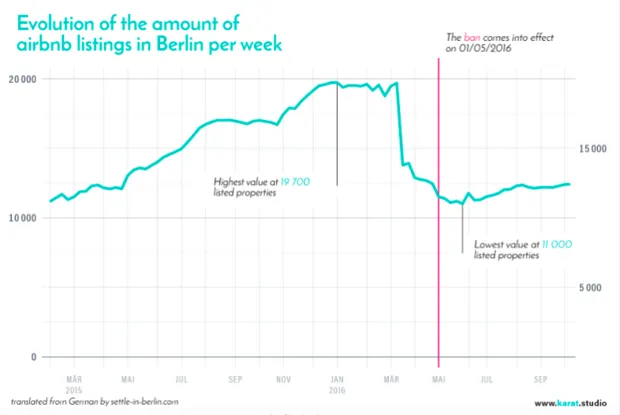 然而,看看可用的数据,情况变得更加复杂。如果像这个 柏林博客,你将现在的柏林Airbnb房源数量与2015年1月的房源数量进行比较,你会发现现在在线的房源数量略有增加(略超过11,000)。这一增长背后的部分原因是,在法律实施前的一年中,房源数量大幅增加,几乎翻了一番,接近20,000。这个数字在法律实施前急剧下降,回落到大约11,000个房源,然后在夏末和秋季再次上升。