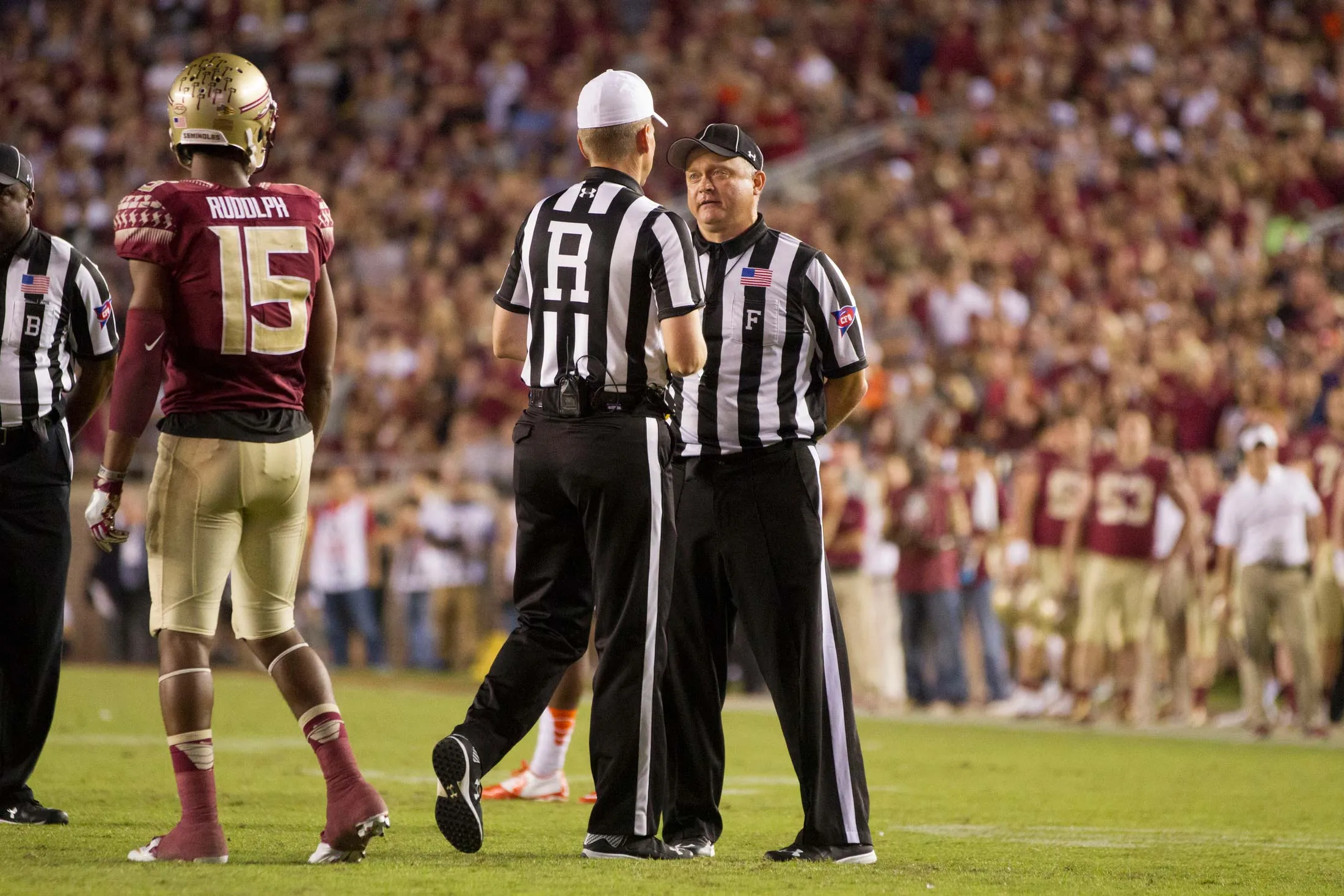裁判组在讨论克莱姆森-佛罗里达州立大学比赛中的一个判罚。摄影师:洛根·斯坦福/Icon Sportswire通过Getty Images与NCAA篮球不同,NCAA篮球的裁判来自由会议团体监督的池子,大多数足球裁判是由各个会议雇佣、培训、奖励和惩罚的。这意味着裁判被赋予做出可能伤害雇主的决定的权力——就像克莱姆森-FSU比赛中的判罚一样。克莱姆森是ACC中更有希望进入大学橄榄球季后赛的球队,并获得其所带来的财务盛宴。