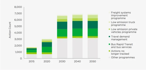 大约四分之三的交通排放来自燃料燃烧,这需要对公共和私人交通进行改革。报告没有列出具体行动,而是确定了该领域内需要重点关注的五个领域。这包括提升快速公交系统的使用,作者写道,这能够在城市内实现三分之一的碳减排。其他措施包括通过改善基础设施吸引更多人使用公共交通、改善货运列车系统以及转向低碳燃料来源。
