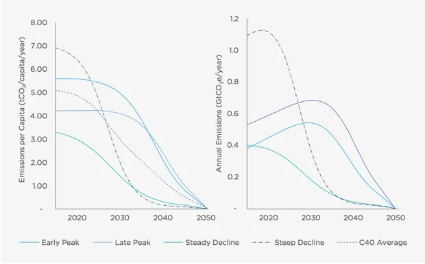 C40将城市分为四组:那些GDP高且碳排放水平高于平均水平的城市需要在接下来的四年内大幅减少排放,而那些碳排放低于平均水平的城市应保持稳定下降。同样,碳排放高的发展中国家城市需要比那些产生较低碳排放的城市更早“达到峰值”并开始减少排放。
