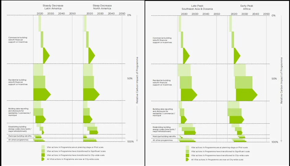 随着城市建设更多的高层建筑和商业办公室以容纳不断增长的人口和经济,对照明和空调的电力需求突显了提高建筑能效的必要性。事实上,报告指出建筑部门在C40城市的碳排放中占据了超过一半的份额。为了解决这个问题,作者呼吁地方政府优先对建筑进行改造,使用更清洁的能源,特别是在发达城市,并收集数据以帮助其他城市制定未来的建筑和能源规范。由于到2020年所需的气候行动中有四分之三集中在这一部门,他们还强调了迅速行动的重要性。