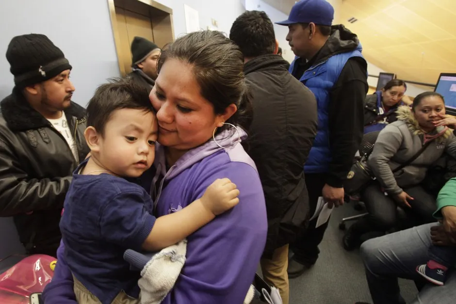 维罗妮卡·拉米雷斯,来自墨西哥,抱着她15个月大的儿子洛拉,正在纽约市排队申请市民身份证。这些身份证不提供给生活在城市边缘的无证移民。美联社/马克·伦尼汉这个故事最初在我们的姐妹网站上以西班牙语发布,CityLab Latino。