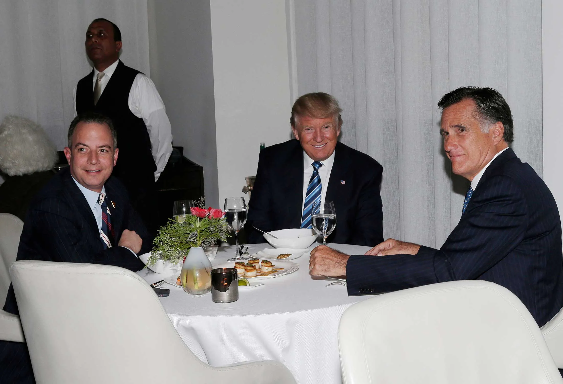 左起:赖因斯·普里巴斯,白宫首席幕僚当选人,美国总统当选人唐纳德·特朗普,以及马萨诸塞州前州长米特·罗姆尼,于2016年11月29日星期二在纽约的让·乔治餐厅共进晚餐。