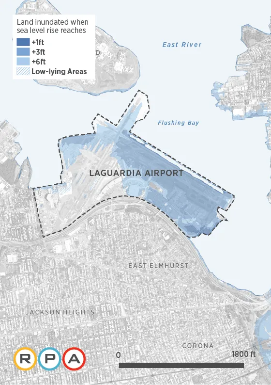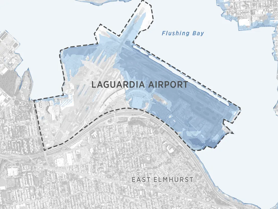 这是拉瓜迪亚机场的地图,显示在海平面上升一(深蓝色)、三(中蓝色)和六(浅蓝色)英尺时的风险区域:
