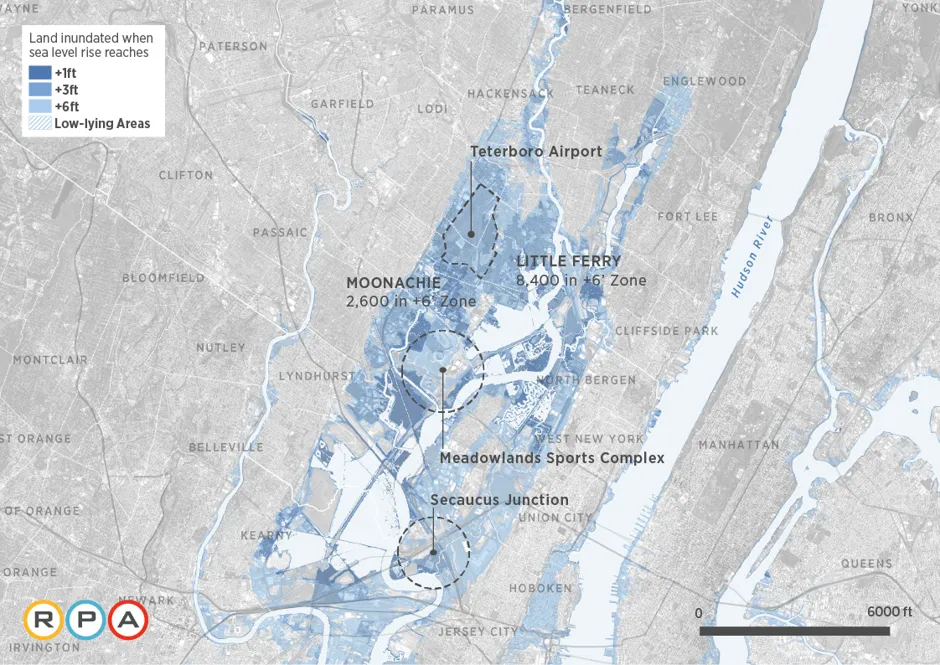 JFK本身在海平面上升一英尺和三英尺时可能会没事。但布罗德频道及其周边地区将无法保持在波浪之上。RPA新泽西州梅多兰地区: