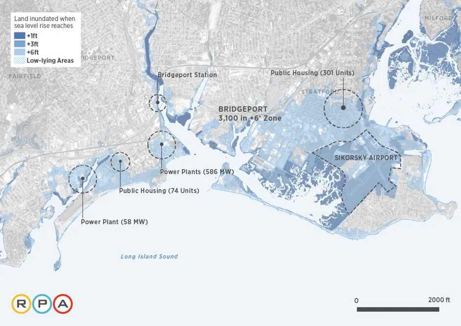 如果海平面上升三英尺,布里奇波特、新哈芬和斯坦福将面临洪水风险。RPA所谓的“好消息”是,已经在这个大区域内提出或正在进行一些洪水 保护项目。最引人注目的是“干线”项目——一条10英里长的公园兼洪水防御巨型结构,沿着纽约市的海滨而建,由明星建筑师比亚克·英厄尔斯设计。但报告认为,尽管这些项目无疑重要,但许多项目无法提供长期保护。