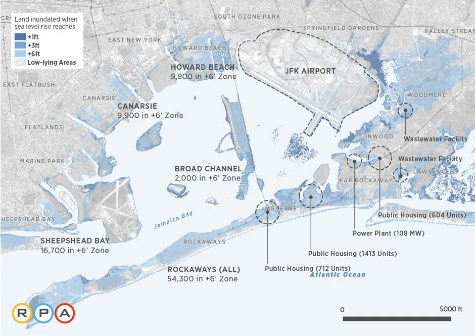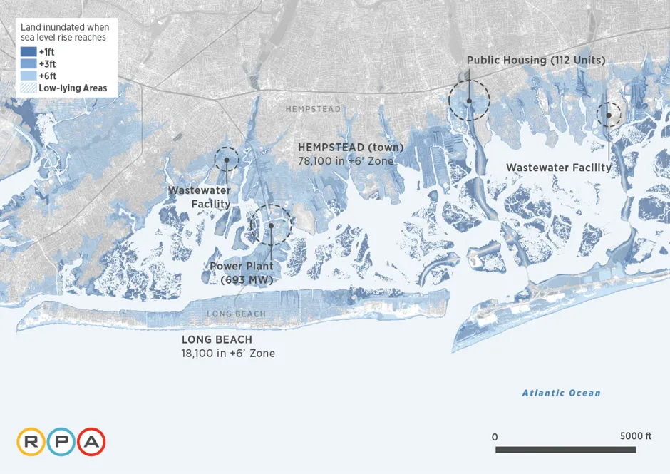 在该地区,大约30,000名居民面临海平面上升的风险。RPA长岛及周边地区: