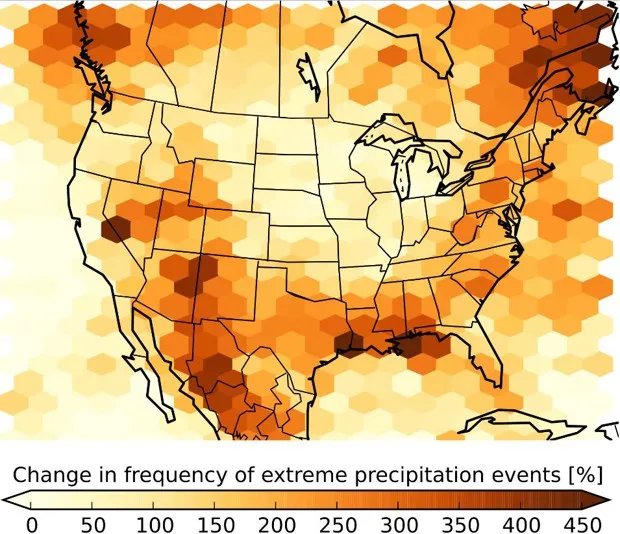 现在我们知道,哪些地区可能会遭受这样的 极端降雨 的冲击,这要感谢博尔德的 国家大气研究中心的科学家们。研究人员使用了耗时一年的全面计算机模拟,发现到2100年,美国墨西哥湾和西南部的许多地方可能会看到夏季极端暴雨的数量增加多达400%。墨西哥也面临极端降雨的大幅增加,风险在大西洋沿岸和落基山脉周围也在上升: