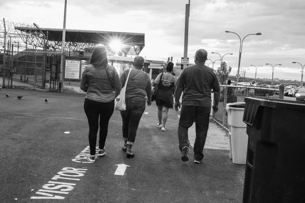 刚下公交车,乘客们朝监狱走去。萨尔瓦多·埃斯皮诺萨通常,大规模监禁的影响从系统内部人们的角度来看是显而易见的。当埃斯皮诺萨开始拍摄Q100公交车上的人时,他想展示它如何影响外面的人。囚犯的亲人们常常围绕着他们何时能去监狱来安排生活,即使只是短暂的探访;埃斯皮诺萨与一位来自布朗克斯的名叫伊瓦娜的女士交谈,她到瑞克斯监狱的三小时旅程结束时只见到了她的儿子五分钟。