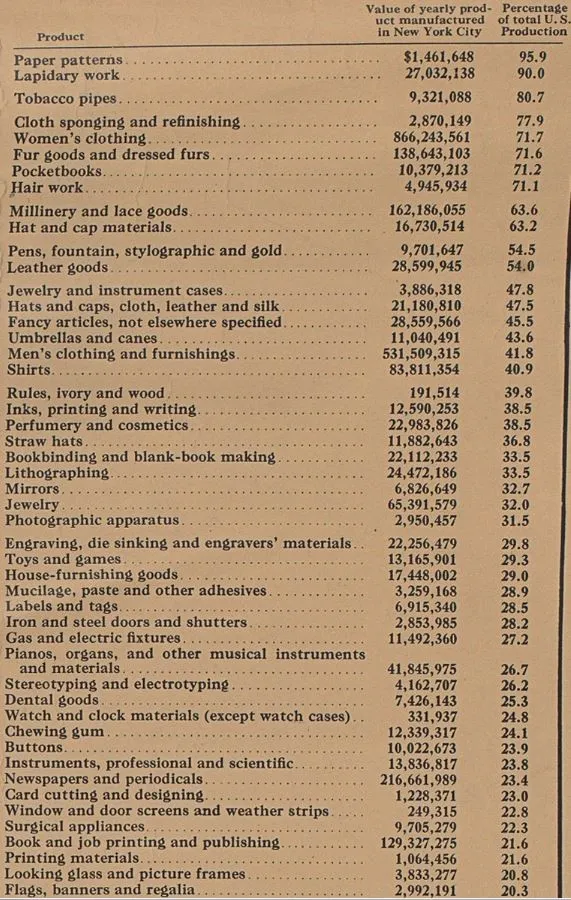 快速扫描显示,1919年的纽约大部分参与了女装的生产。这个市场涉及8,091家工厂(所有行业中最多),雇佣了169,965人,年产品价值为17亿美元。