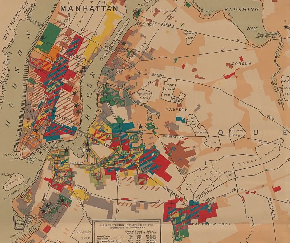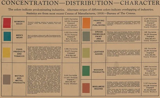 答案在于这张精彩的历史地图,它展示了各个社区的制造业。该地图由纽约商会于1922年绘制,使用了1919年的普查数据,文档揭示了城中所有的巧妙活动,从制衣到化学和药品生产,再到“杂项”,这一类别包括橡胶轮胎、雨伞和手杖、牙科设备,以及“概念和新奇产品”。