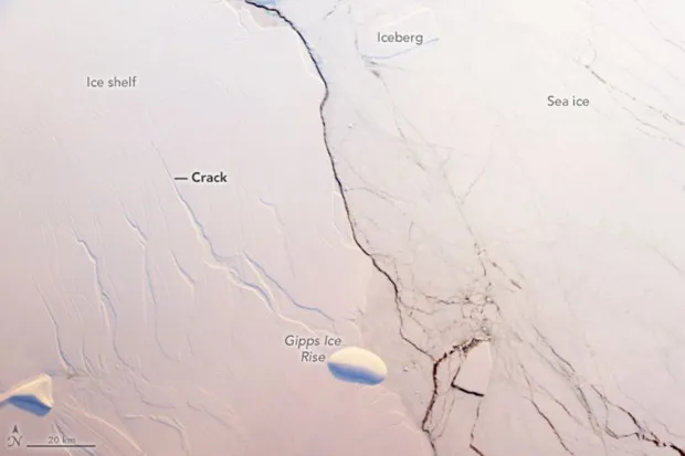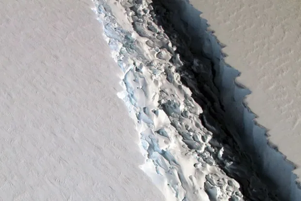 约翰·索恩塔克/NASA任何盲目走过 南极半岛的人可能会面临一次巨大的跌落。一条宽达300英尺、深达三分之一英里、相当于七艘叠放的游轮高度的巨大裂缝正在横贯这片土地。