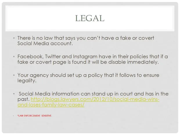 警察问责组织的联合创始人 露西·帕森斯实验室的詹妮弗·赫尔斯比向城市实验室提供了一份由库克县警长办公室情报中心前员工准备的幻灯片,揭示了警方如何使用社交媒体。该演示文稿向情报分析师展示了如何从Twitter、Facebook和Instagram中挖掘位置信息和内容数据,并建议他们设置假账户和组建相关人员的档案。