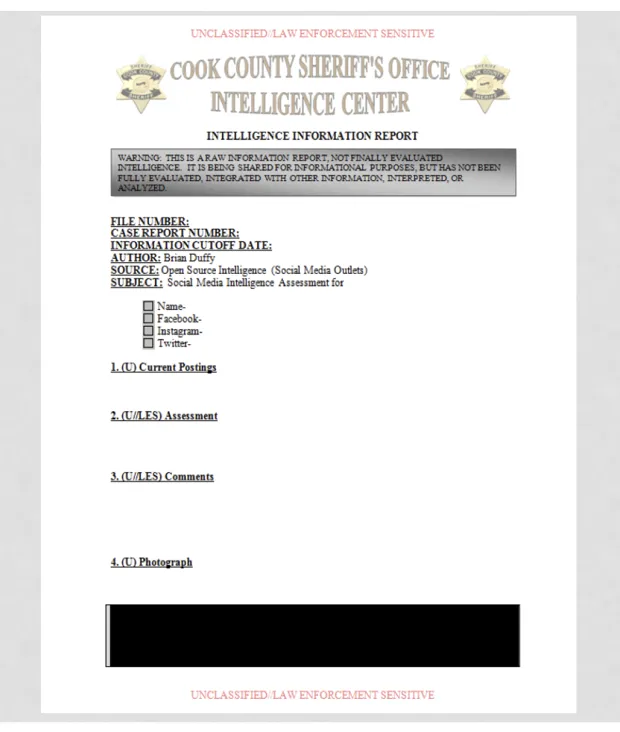 虽然社交媒体监控通常被认为是针对特定地点或术语,例如标签,但库克县警长办公室的记录表明,情报分析师也在收集有关关注对象的信息,以便长期保存,而不仅仅是为了“情境意识”在公共活动中。例如,这里有一份“情报信息报告”的样本,用于收集照片和其他信息。