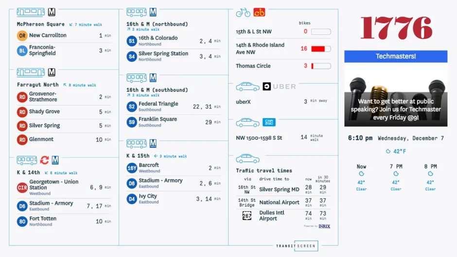 这么多选择,但它们却没有让人感到不知所措。TransitScreen火车、公交、Uber,还是共享单车?想想你在寻找最合适的交通选项时浪费了多少时间。无目的的滑动,遇见有目的的瞥见:TransitScreen,这家初创公司构建了每个地点的实时交通选项显示,升级了外观,设计暗示着未来交通的更无缝的单一平台。