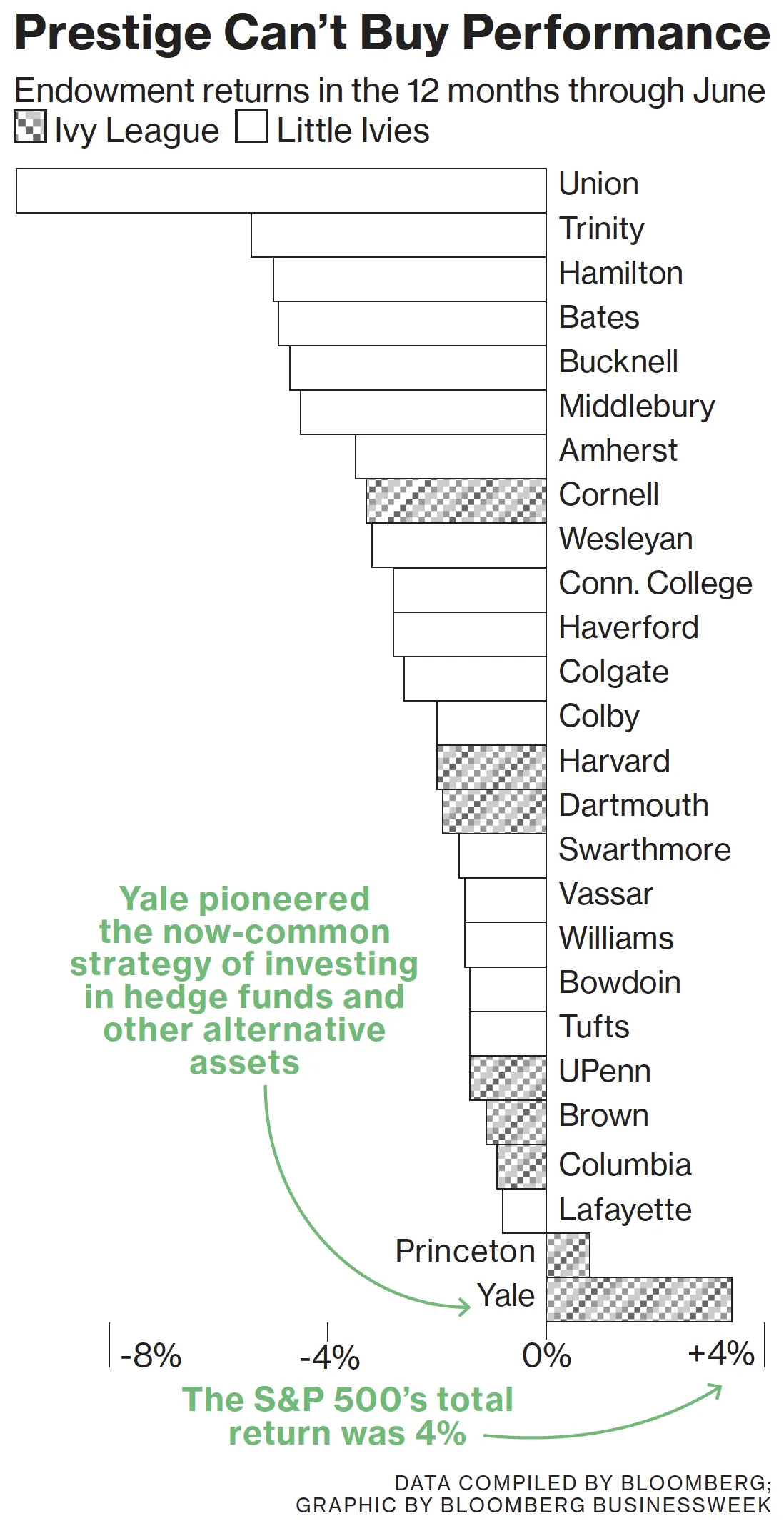 在这12个月中,一组被称为“小常春藤”的18所文理学院平均损失了3.3%。这低于由剑桥协会追踪的450个捐赠基金的平均损失2.5%。根据彭博社汇编的数据,八所常春藤联盟学校在同一时期平均下降了0.8%。