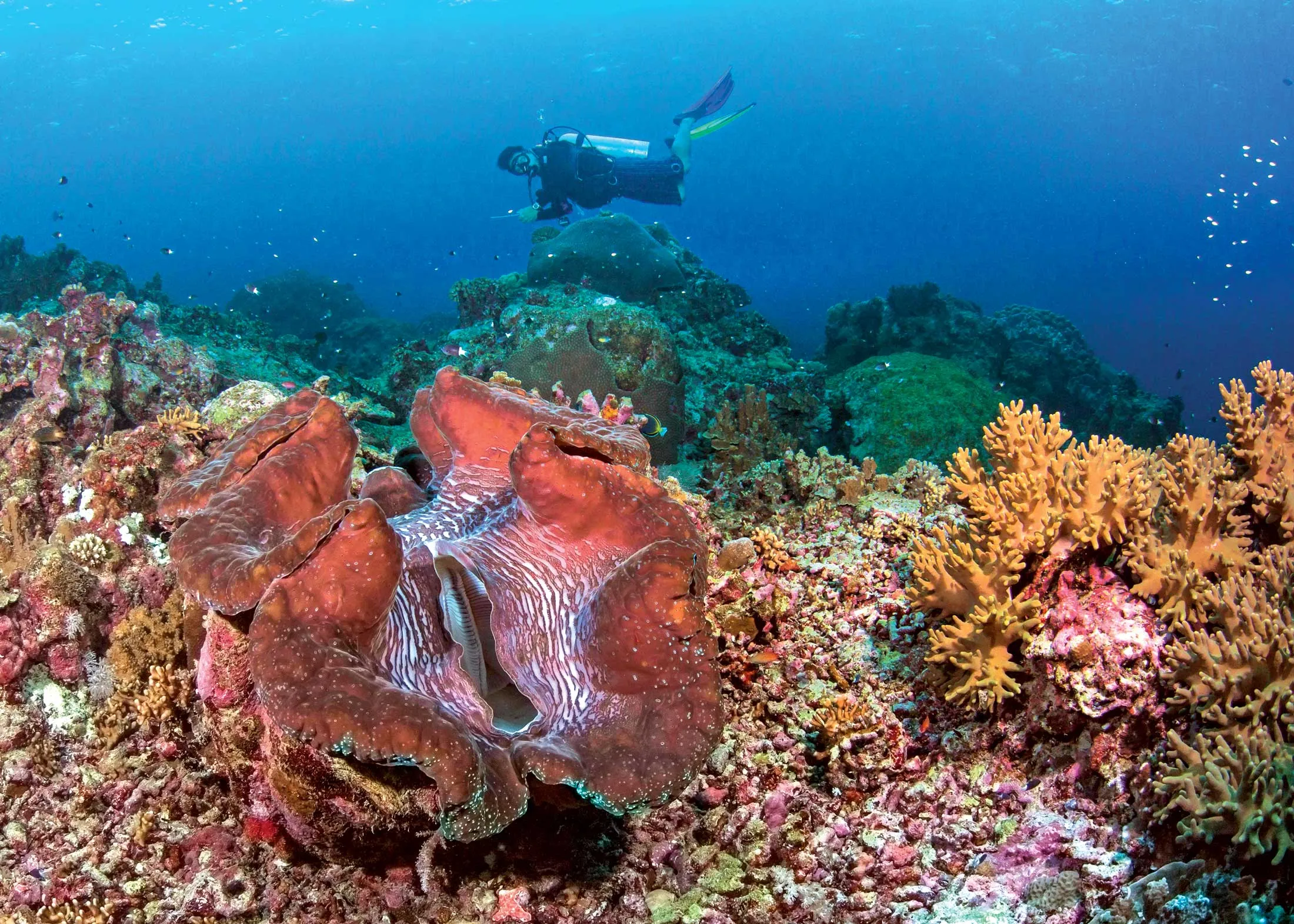 巨型蛤蜊是印度-太平洋水域丰富珊瑚礁系统中的重要物种;它们固定海藻和海绵,为幼鱼提供庇护,并帮助积累随着时间推移而形成的钙质沉积物。在水下,优雅起伏的外壳分开,露出五彩斑斓的肉体:蓝色、绿松石色、黄色和橙色——斑驳且点缀着更多颜色。最大的可以达到近5英尺宽,重达600磅以上。它们长期以来因其肉而被捕猎,同时在水族市场上也备受珍视,尽管它们受到国际法的保护。