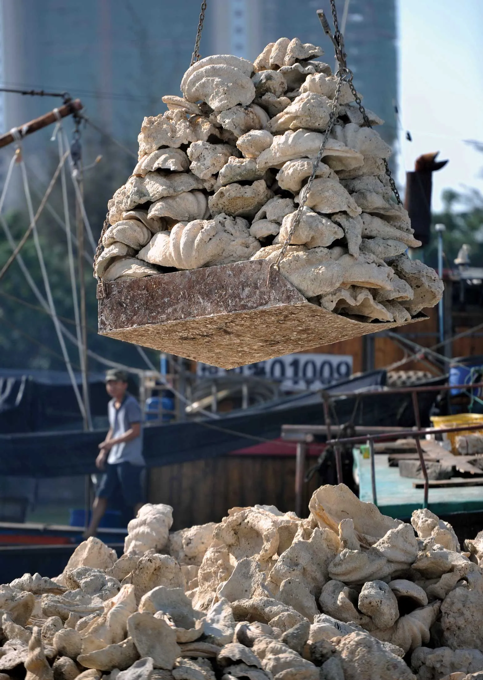 在中国海南省,一批破坏珊瑚礁的巨型贝壳被卸货。摄影:想象中国2012年4月,一艘菲律宾海军舰艇在斯卡伯勒浅滩附近遇到了12艘中国渔船,该浅滩是一个58平方英里的几乎完全淹没的珊瑚礁环,环绕着一个只有一个狭窄入口的泻湖。来自该浅滩的贝壳因其紫色而售价不菲,有的甚至高达30,000元人民币。菲律宾、台湾和中国均声称拥有斯卡伯勒,该浅滩距离菲律宾最大的岛屿吕宋岛超过140英里,距离潭门大约三倍半的距离。菲律宾士兵登上渔船,发现船上装满了数百个贝壳。几个小时内,中国政府船只赶到与菲律宾人对峙,菲律宾人最终撤退。从那时起,中国一直控制着斯卡伯勒。