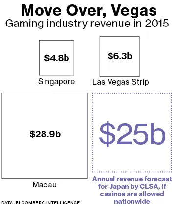 在规划过程中,官员们正在密切关注新加坡。2014年,日本首相安倍晋三参观了这个城市国家的两个综合度假村,这些度假村将赌场与酒店、会议厅、购物中心、剧院,甚至主题公园和水族馆结合在一起。新加坡去年产生了约48亿美元的赌博收入。根据彭博情报,新加坡的金沙博览和会议中心面积超过12万平方米,是东京最大展览和会议设施的50%。CLSA分析师杰伊·德菲博说,综合度假村将使日本的博彩设施更快地实现规模化。“我们谈论的是成千上万的人同时聚集在新的赌博大厅附近,仅仅是来自会议中心。”