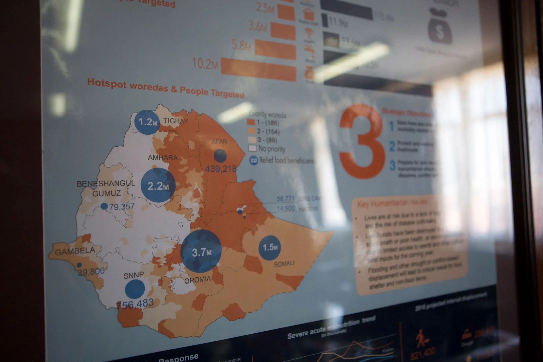 关于埃塞俄比亚人道主义响应的地图和数据在卡萨的办公室。摄影师:扎卡里亚斯·阿布贝克为《彭博商业周刊》拍摄在10月,卡萨的团队计算出需要紧急食品的人数在两个月内翻了一番,达820万人,这促使政府正式请求人道主义援助。到12月,1020万人需要食品。他还担心继续帮助那些在条件稳定时接受援助的许多长期食品不安全的埃塞俄比亚人。总的来说,卡萨将不得不为超过1800万人提供食品——几乎占该国人口的五分之一。