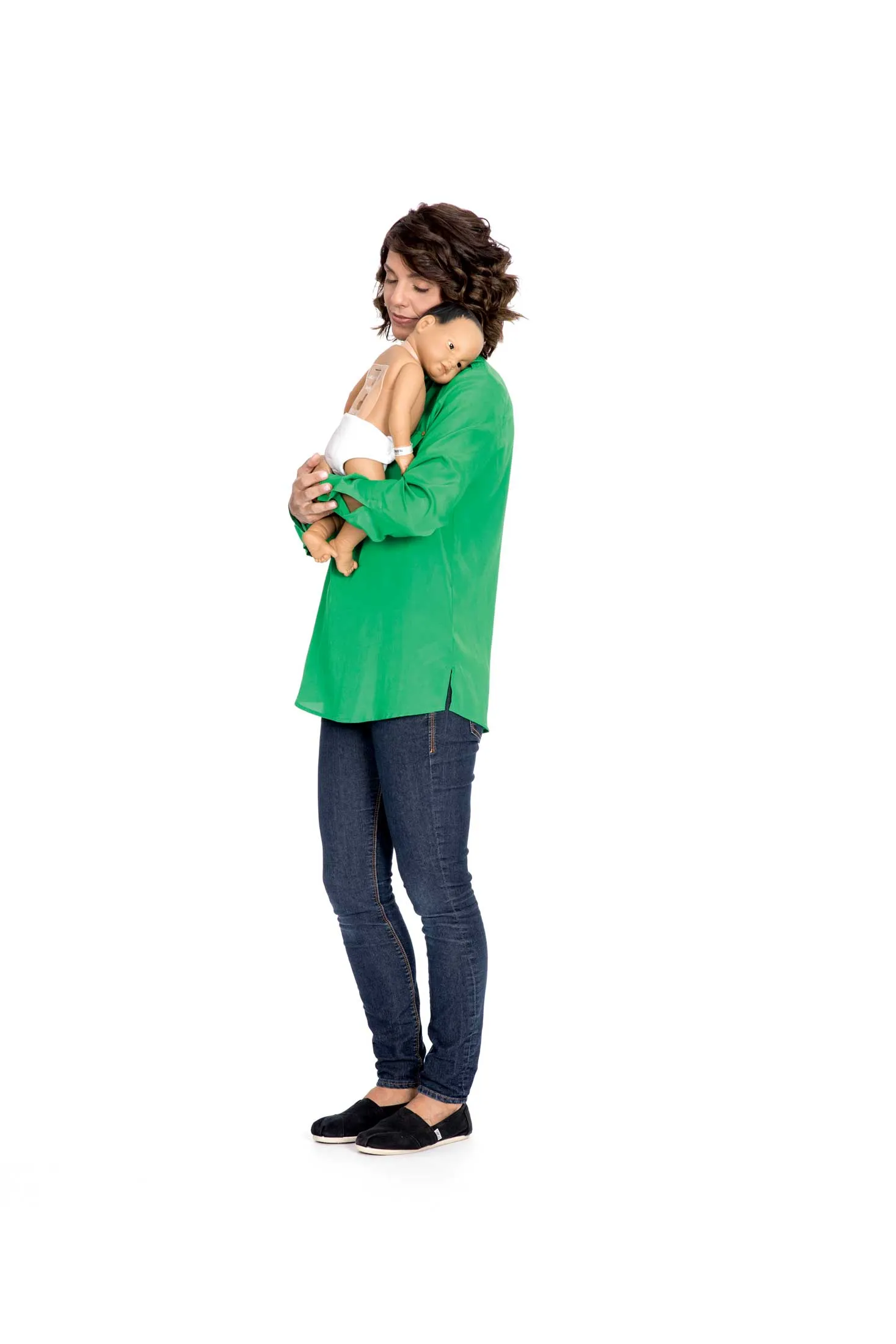 随着每一次哭泣——真实婴儿的录音,按照真实的时间表——Shaila 将有两分钟的时间将一个配备传感器的手环在婴儿肚子上的另一个传感器上滑动。然后她必须决定该怎么做:用配备传感器的奶瓶喂婴儿,给它换配备传感器的尿布,还是简单地摇晃它直到它再次进入睡眠模式。就像对待真正的新生儿一样,Shaila 需要支撑婴儿的脖子并监测它的体温。在周一,Conrad 会下载婴儿的数据以评估她的表现。