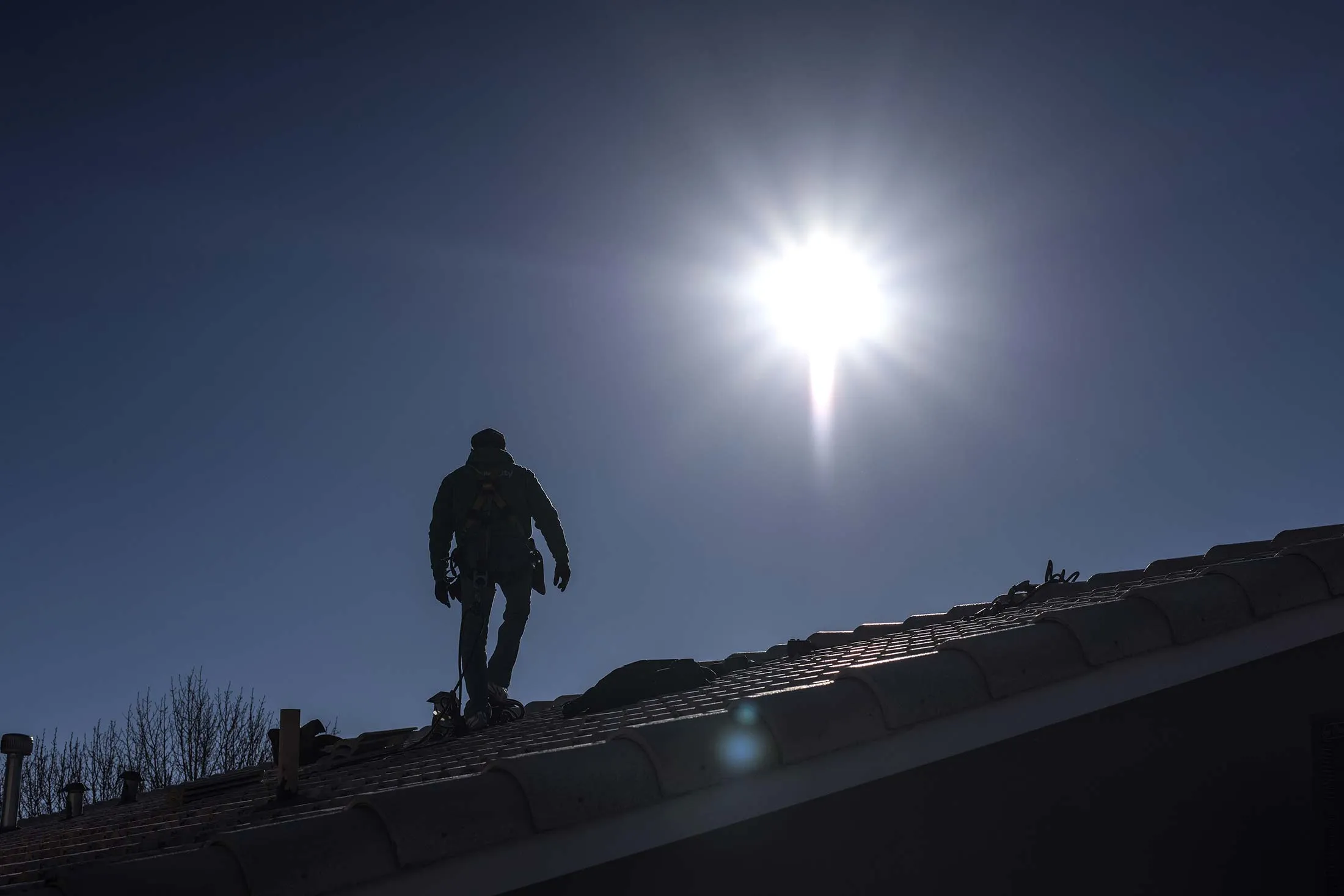 在2016年2月8日,美国新墨西哥州阿尔伯克基,SolarCity Corp.的住宅安装中,一名工人的轮廓被看到走在屋顶上。SolarCity计划在2月9日发布财报。