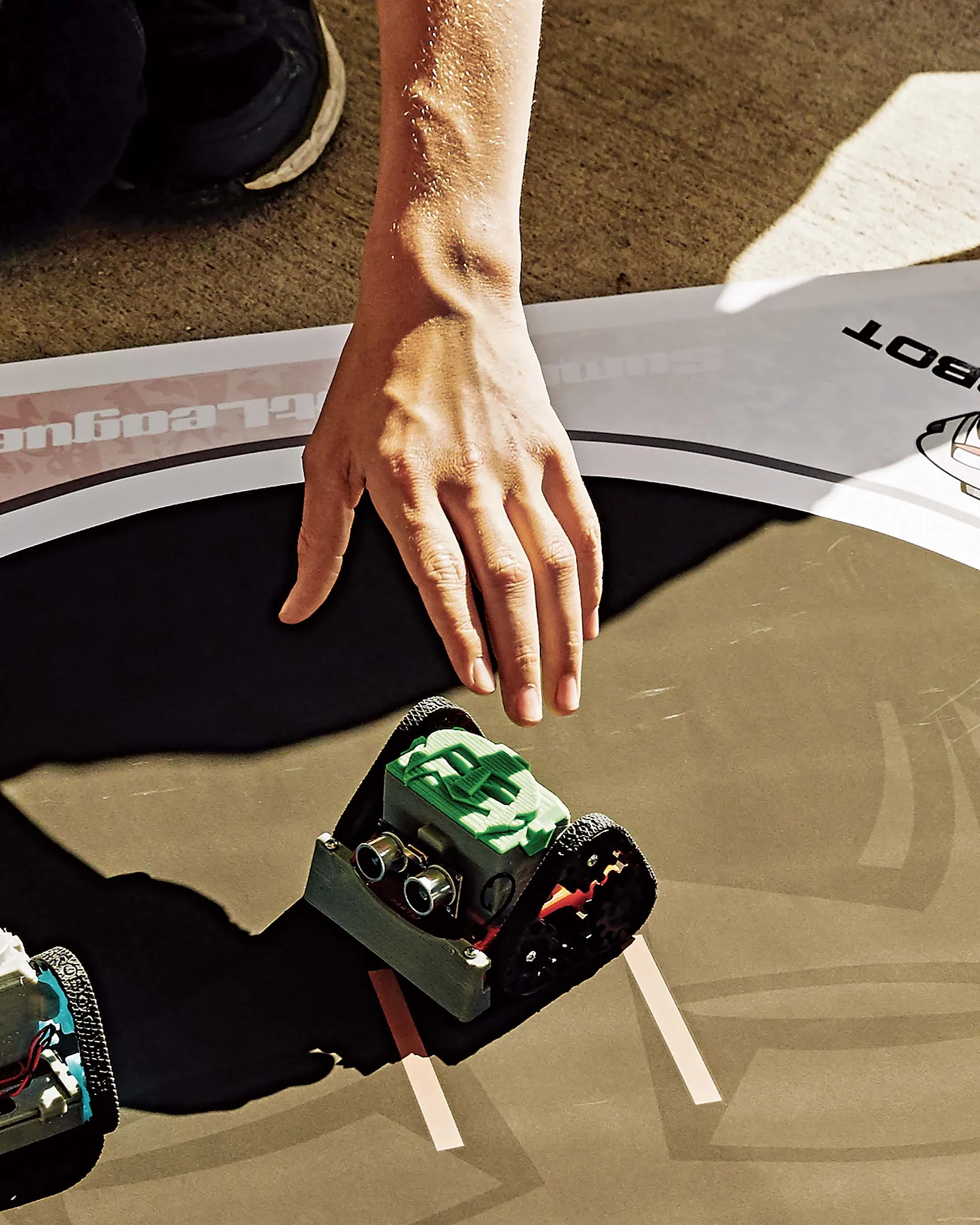 一旦建成,这些机器人依靠其编码和机载传感器试图将彼此推出相扑擂台。摄影师:德文·克里斯托弗,彭博商业周刊
