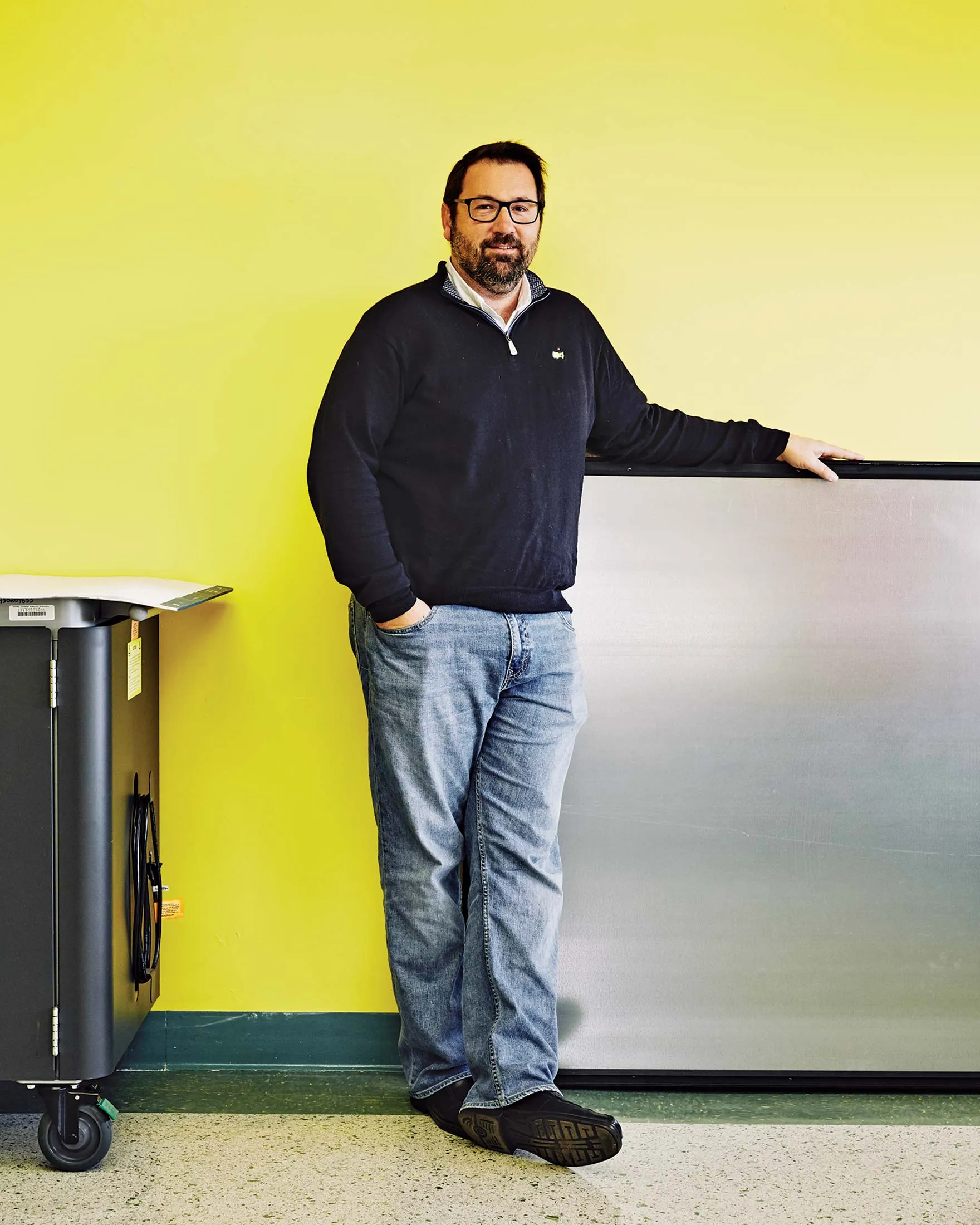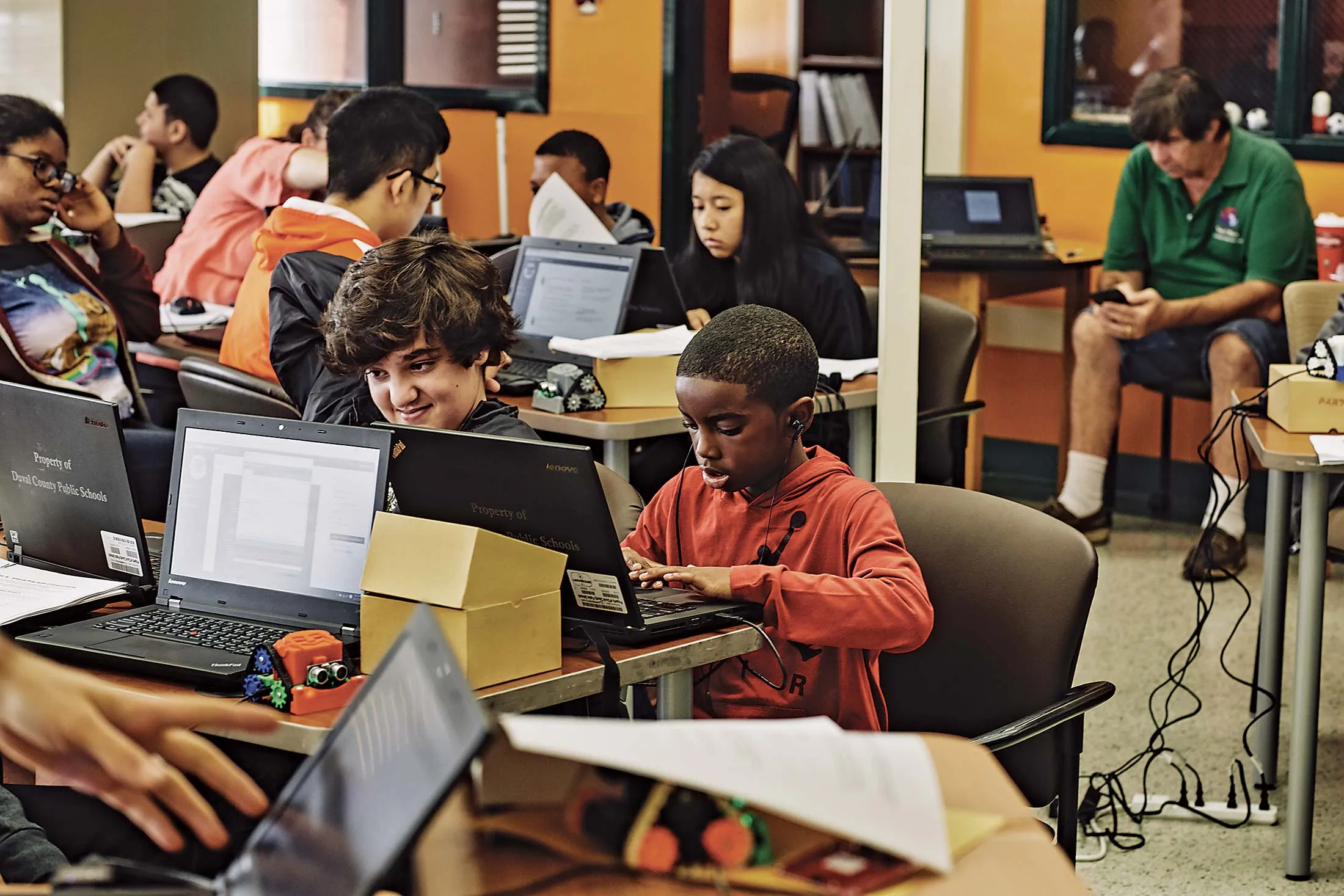 帕克(上图)和威尔·阿什比,联盟唯一的有薪员工,培训教师编程,制造机器人,并组织比赛。摄影师:德文·克里斯托弗,彭博商业周刊