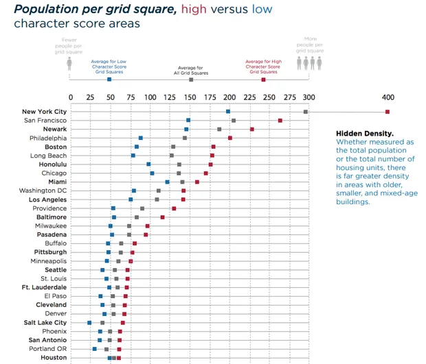不幸的是,互动地图不允许你叠加每个街区的可负担住房单元数量——你只能接受报告的分析,以及城市特定的事实表,这些事实表深入一些额外细节,表面价值。报告确实包含了一张有趣的图表,比较了特征和密度(如下),这可能对那些将新建建筑视为增加密度唯一答案的人感兴趣。与其将历史建筑视为拆除的目标,为什么不先看看它们内部的空置空间呢?此外,作者写道,“如果将地面停车场替换为住房、办公空间和零售,能够实现多少额外的发展潜力?”