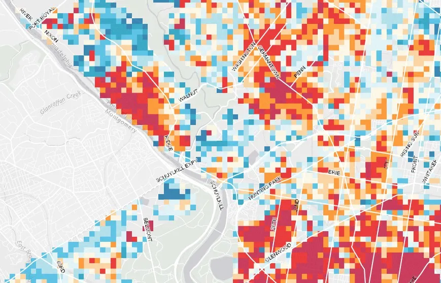 费城的罗克斯伯勒地区,通过“特征”进行绘制。再城市化地图集也许这并不令人惊讶;你会期望老旧、密集的市中心附近地区具有更高的特征评分,而新建的、密度较低的郊区则得分较低。在地图集完全绘制的五个城市中——芝加哥、纽约、费城、休斯顿和洛杉矶——这一模式基本上是成立的。但在互动地图中玩弄数据层提供了一些关于特征存在与否的新观察。赖斯大学金德城市研究所的城市历史学家凯尔·谢尔顿(Kyle Shelton)对费城的特征评分进行了切换,并在城市边缘博客上写道: