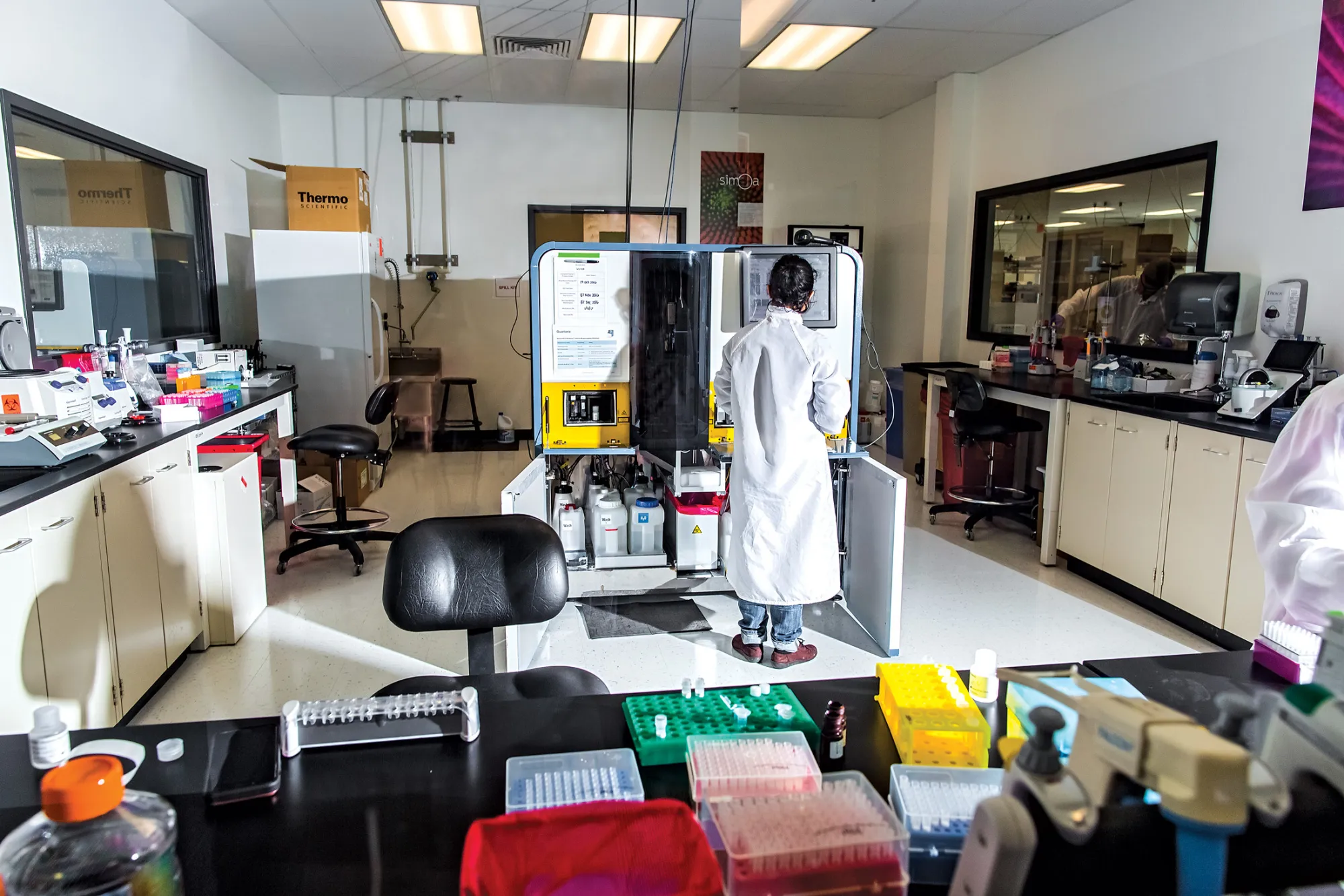 在穿上白大褂和防护眼镜后,我们进入实验室,观看技术人员加载Quanterix Simoa HD-1分析仪。这个机器大约有两个冰箱的大小,内部有一种称为单分子阵列的微观技术。Simoa使用数百万个微小的珠子,每个珠子大约是人类头发宽度的三十分之一,困在数百万个微小的井中,以检测血液中的蛋白质。