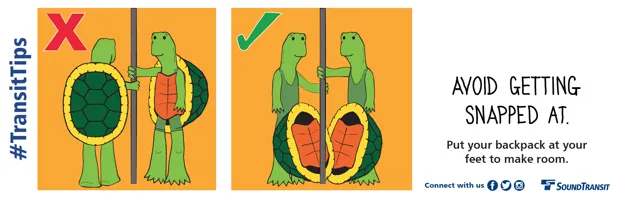 他们也可以为特殊场合修改海报。在去年12月西雅图的职业足球队赢得冠军后的第一个工作日早晨,SoundTransit 发布了一张网上的图片,展示了上述海龟戴着Sounders围巾,以提醒球迷在拥挤的列车上注意背包。礼貌的乘客也应该感到像赢家一样。