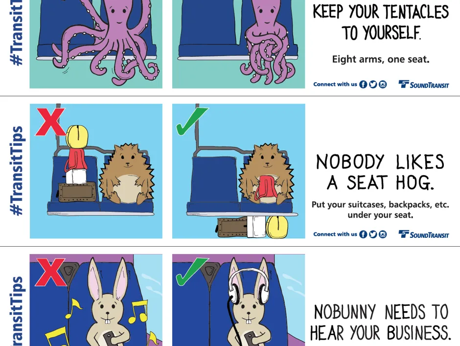 随着去年在高密度的国会山社区和大学区开设两个新的链接站点,以及未来六年的进一步扩展计划,越来越多的西雅图居民预计将放弃汽车,选择公共交通。该地区的交通管理局希望确保在这个著名的消极攻击城市中,新老乘客不会互相烦扰,因此他们一直在使用卡通动物来传达一些关键点。