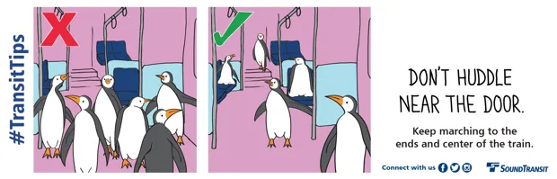声音交通“我们每天都收到关于乘坐我们系统的评论,”声音交通公共信息官金伯莉·瑞森说。“‘我总是被背包打脸!’或者‘人们总是聚集在门口!’所以我们决定使用图形表示来说明该做什么和不该做什么,”她补充道。“一旦活动启动,人们就喜欢它。即使在我们的服务区域之外。”
