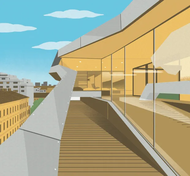 维也纳的Ray 1房屋,由Delugan Meissl设计,被“想象为地球与天空之间的‘可渗透边界区域’。”金宝允/TASCHEN