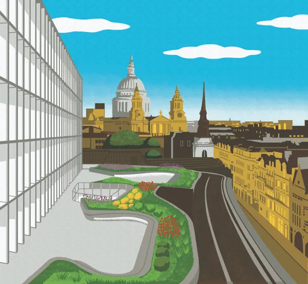 由Gustafson Porter London设计的新卢德盖特南向屋顶露台的绘图。“一个曲线形的白色Corian长椅提供了宽敞的座位。它的形状环绕着露台的边缘,逐渐增高,为密集种植方案提供了充足的土壤深度。”Boyoun Kim/TASCHEN经济理由 利用屋顶空间 的理由 很强。转变为花园、酒吧或餐饮空间,曾经被忽视的垃圾区域“突然获得了新的价值,”Jodidio写道。而且还有 生态优势,Jodidio补充道:“一层土壤和一棵生长茂盛的树木种植在离地面200米的地方,可以保护和庇护内部空间免受可怕的热量增益或损失。”安装绿色屋顶的初始投资可能会在降低能源账单和更健康的环境中得到回报,同时也带来美学价值。