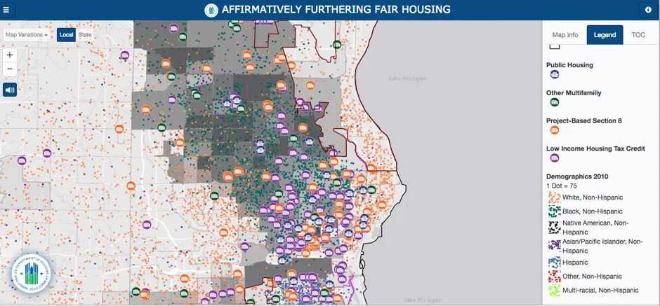 换句话说,它为地方社区执行1968年《公平住房法》所要求的内容提供了一种方式。它还为他们提供了人口和住房数据,以清晰地可视化他们社区的住房趋势。例如,当地利益相关者可以使用这张威斯康星州密尔沃基的地图来看到大多数补贴住房位于隔离社区,并相应地进行规划: