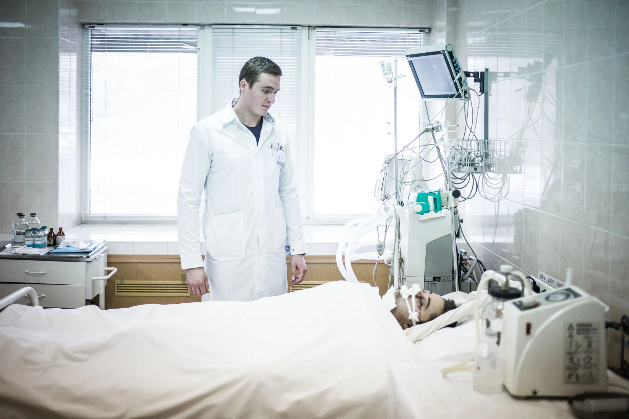 随着与俄罗斯的冲突升级,像他这样的医生忙于接收源源不断的伤员和平民。走进重症监护病房,可以看到两名重伤士兵,其中一人因头部受伤而昏迷。