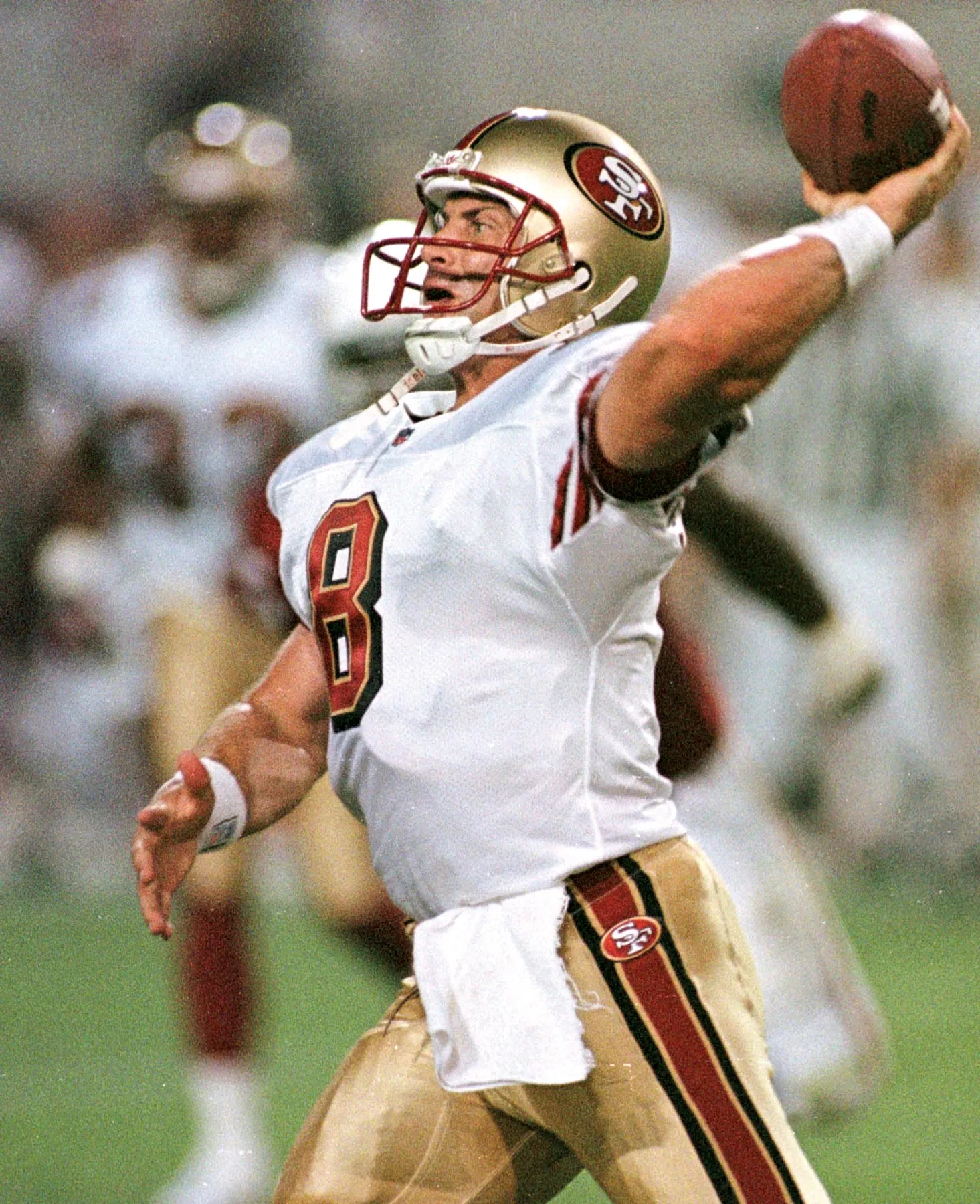 1999年,对阵亚利桑那红雀队。来源:49人队提供在 Young 最近出版的自传 四分卫:我在旋转背后的生活 中,有一个时刻,他在大学时给父亲打电话,说他需要一笔车贷。他是杨百翰大学的校队四分卫,想要时尚地在校园里出行。他的父亲有一个更经济的主意:他将跨越整个国家,给 Young 送去他的老斯莫比尔,里程表上超过 20 万英里。Young 回应道:“哦,拜托,爸爸。绝对不行!”