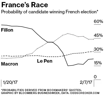 摄影师:玛琳·阿瓦德/彭博社如果法国2017年总统选举是一部电影,可能的标题不会少。第三者的复仇 或 领跑者的诅咒。不喜欢这些?距离投票还有两个月半,情节反转层出不穷,肯定会有很多其他可能性。