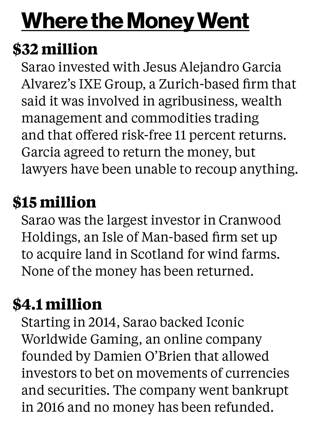 根据知情人士的说法,到2015年4月萨拉奥被捕时,他在全球的投资中约有5000万美元被锁定,甚至现在也不确定这些钱是否都算在内。正是在他的律师试图追回这些钱时,他被迫面对这些钱可能已经不见的可能性。萨拉奥在那年8月被释放,他的父母以家庭住宅作为5万英镑保释金的抵押。