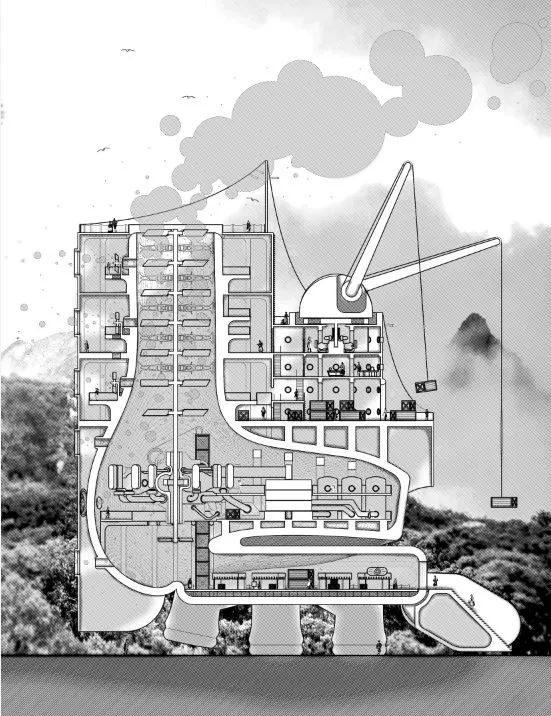 根据他在 2017年童话的简介,这位芝加哥建筑师通过“在使巨大、侵略性机器人性化的传统中工作”来构思这些疯狂的东西。 (“城市行者”的另一个标题是“被遗忘的驯化和生物工业的可能性”,在一个建立在 漂浮的“土星”环上的文明之后获得了第二名。)赫克托的灵感来源包括 美国海军监视者号——这艘看起来像蒸汽朋克的内战铁甲舰——以及宫崎骏,他在2004年的 《哈尔的移动城堡》中构思了自己的摇摆定居点。