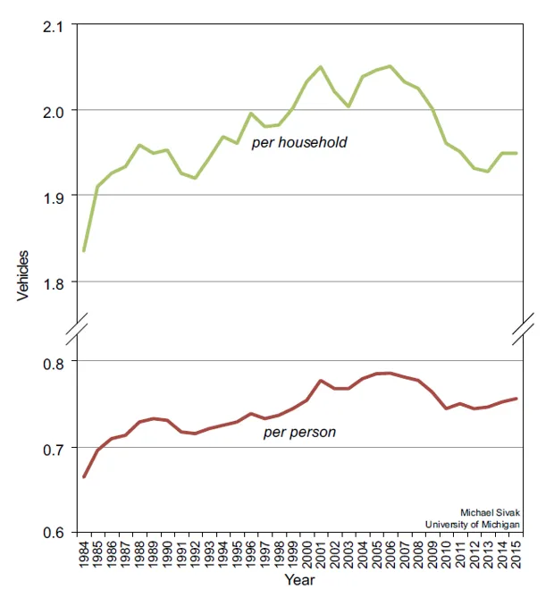 在2006年之后,汽车拥有量和车辆行驶里程开始下降。但这项研究的最新成果,由密歇根大学可持续全球交通研究联盟负责人迈克尔·西瓦克进行——显示出复苏的迹象。在2015年,汽车拥有率比2012年平均上升了1.4%。汽车拥有量从2012年的每人0.744辆上升到2015年的每人0.756辆,从2013年的每户1.27辆上升到2015年的每户1.95辆。平均行驶距离从2012年的每人8,461英里和每户21,866英里增加到2015年的每人8,648英里和每户22,311英里。