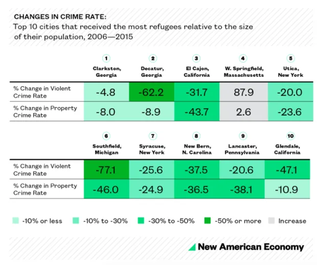 FBI犯罪数据由当地警察报告,并不完美。这就是为什么对于一些城市,犯罪变化反映的是较短时间段的原因。当然,十个相对较小城市的趋势并不一定反映全国更大城市中正在发生的事情,这些城市正在接纳难民。但总体结论是——移民与较低犯罪之间存在强相关性——得到了充分支持 的 研究。