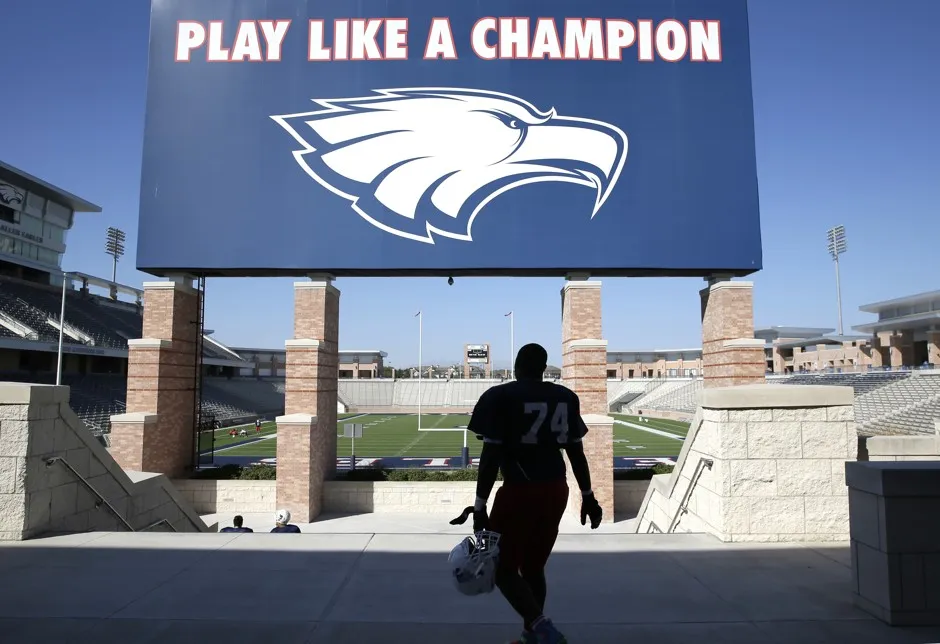 体育场建设热潮最近 引起了全国关注并激发了 深夜电视的笑话,但实际上早在十多年前就已经开始,当时普莱诺东高中的汤姆·金布罗体育场于2004年开放,拥有9800个座位和2000万美元的价格标签。随后又有几个类似设施相继建成。四年前,艾伦独立学区在开设当时建造的最昂贵的高中体育场时将竞争提升到了一个新水平:一个7200万美元的设施,拥有18000个座位——大约是典型NBA竞技场的大小。(该体育场在2014年因混凝土梁出现裂缝而关闭了15个月,并进行了1000万美元的修复。)它配备了一个38英尺的视频屏幕记分牌。