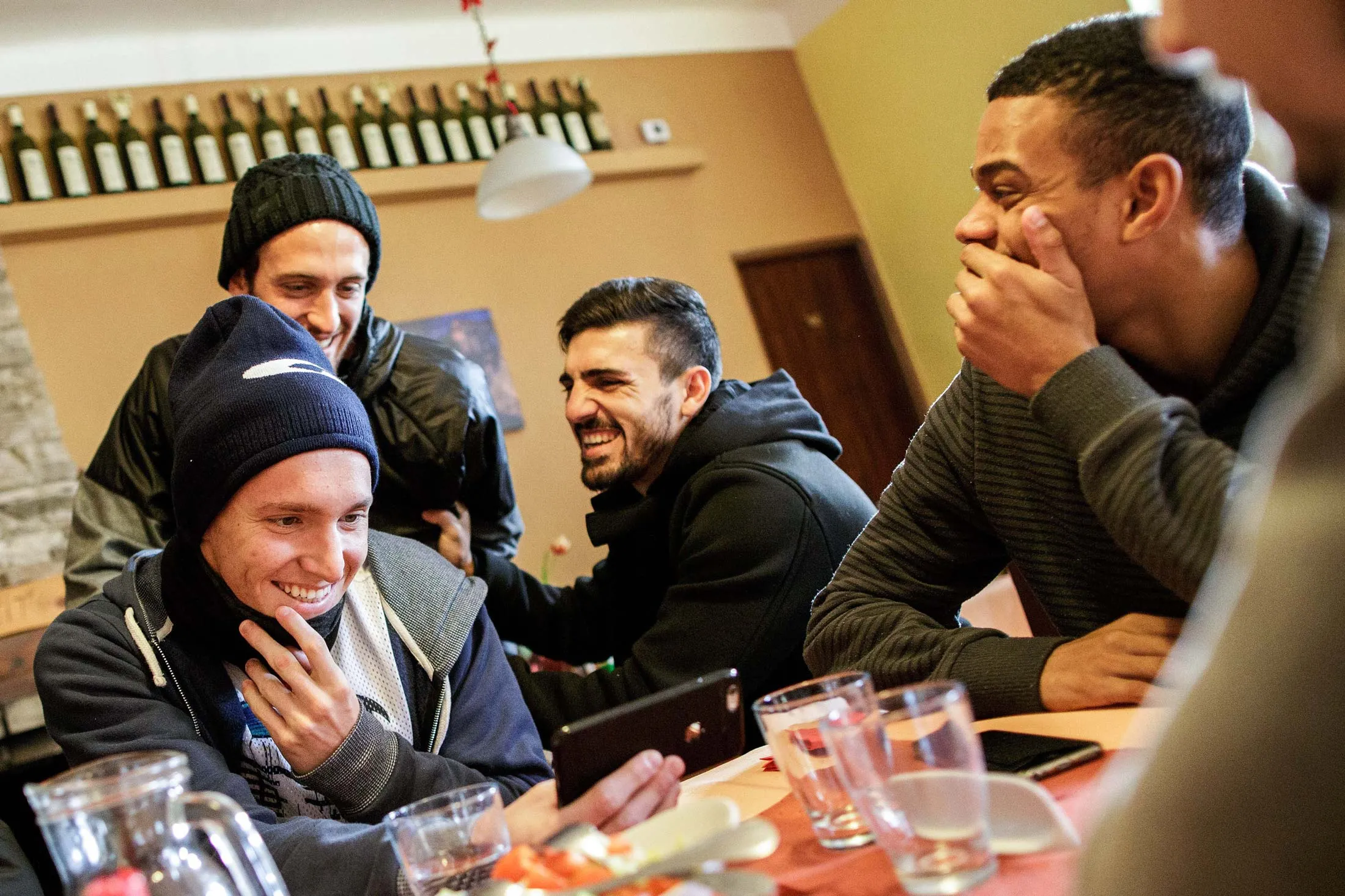 彼得森·西尔维诺·达·克鲁兹(中间)和巴西足球俱乐部弗鲁米嫩塞的球员们在斯洛伐克萨莫林的一家餐厅享用午餐时笑着。摄影师:莉西·尼斯纳/Bloomberg在匈牙利热身赛前的训练课上,巴西球员们在菲亚尔霍身后排成一队,开始冲刺训练。菲亚尔霍在巴西之外的岁月让他流利地讲英语,他可以翻译芬兰教练米卡·隆斯特罗姆的指示。