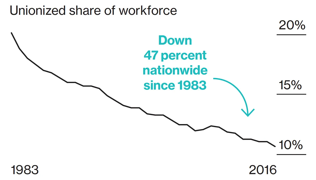 插图:731去年,属于工会的美国工人总比例降至10.7%,创历史新低。这个数字在未来几年可能会进一步降低。在经历了数十年的会员减少后,工会面临生存危机,因为工作权法案在州和联邦层面被推动,将禁止他们从所代表的工人那里收取强制费用,这是组织劳工的一个关键收入来源。